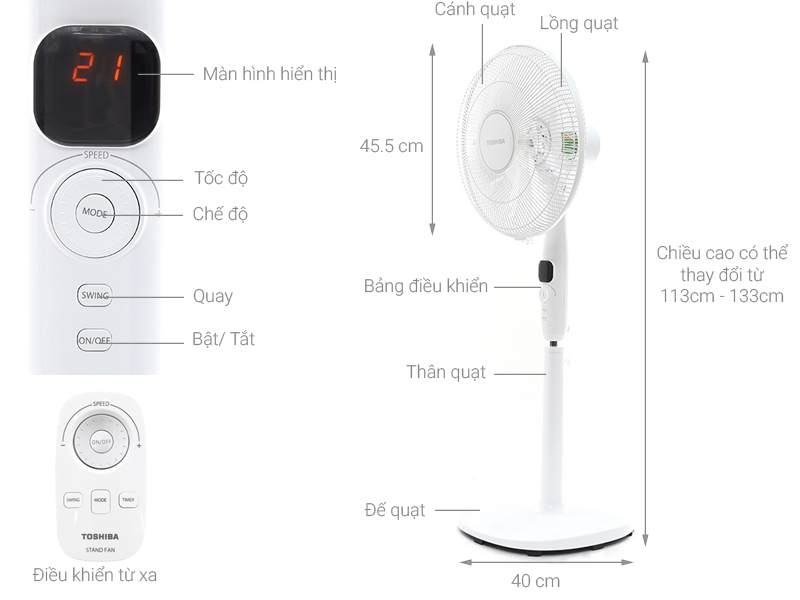 Kiểu quạt đứng, thay đổi độ cao dễ dàng với núm vặn. Điều khiển từ xa với nút nhấn dễ hiểu, tiện điều chỉnh chức năng. Lồng quạt tháo rời giúp việc làm sạch, vệ sinh lồng quạt, cánh quạt đơn giản hơn.